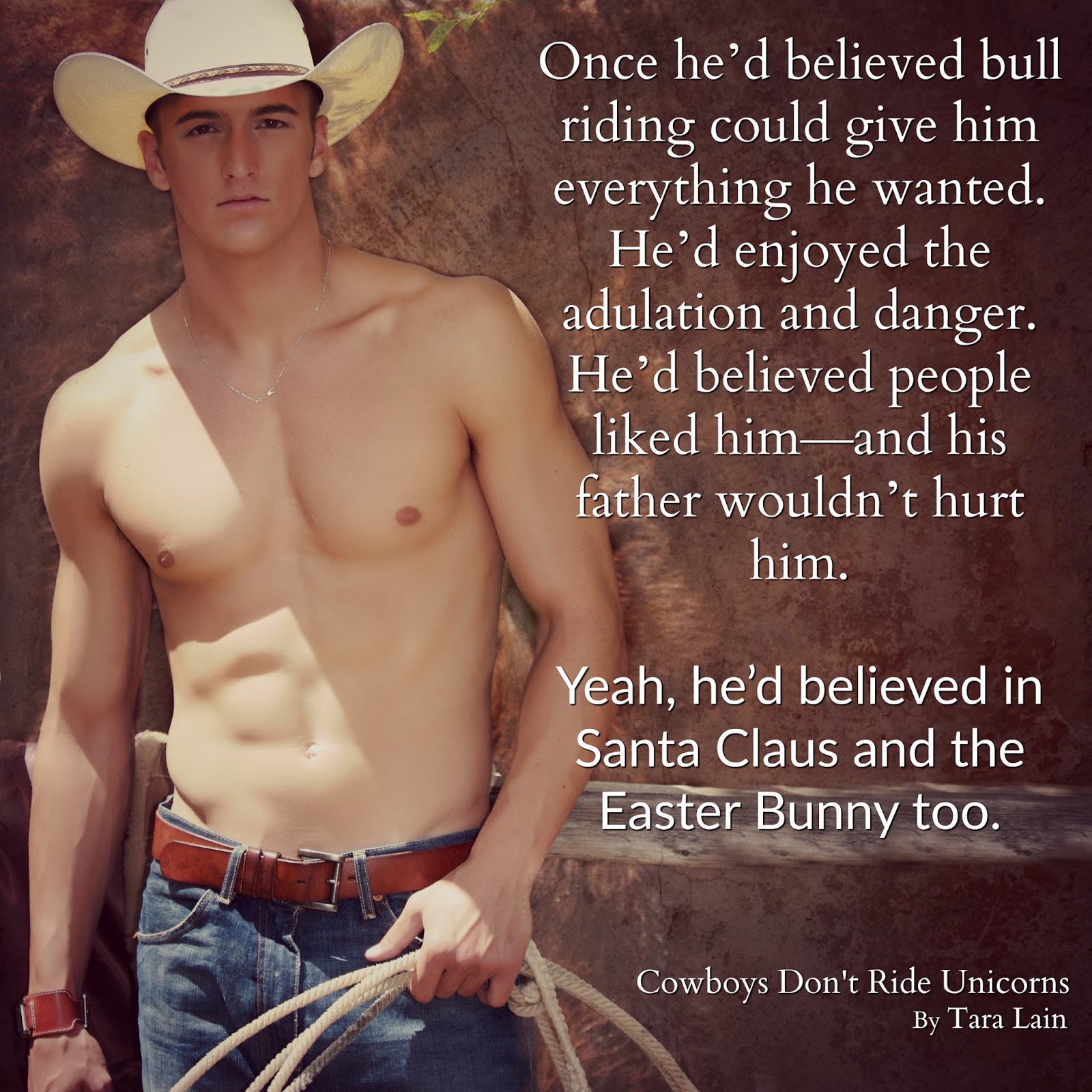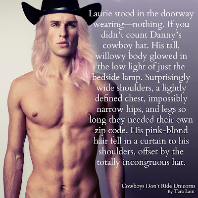 Hi everyone. I’m so happy to be here. I’m Tara Lain and I write the Beautiful Boys of Romance. Today, I’m celebrating the addition of some new gorgeous guys to my pantheon in a book called Cowboys Don’t Ride Unicorns. It’s my second ever cowboy romance and my first bull rider. In this story, my hunky bull rider meets his “unicorn”, a beautiful, androgynous, pink-haired interior decorator who likes to top! He’s not only a rare unicorn, he’s very much a Tara Lain Beautiful Boy.