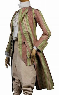 “His coat was a pink-and-ivory striped affair—very bold, particularly when teamed with the Nile green satin breeches. Clocked stockings of pale pink silk, intricately embroidered with a pattern of twisting leaves, graced his well-shaped calves, and his silver-buckled shoes had fashionably high heels that clacked on the cobbles as he walked.